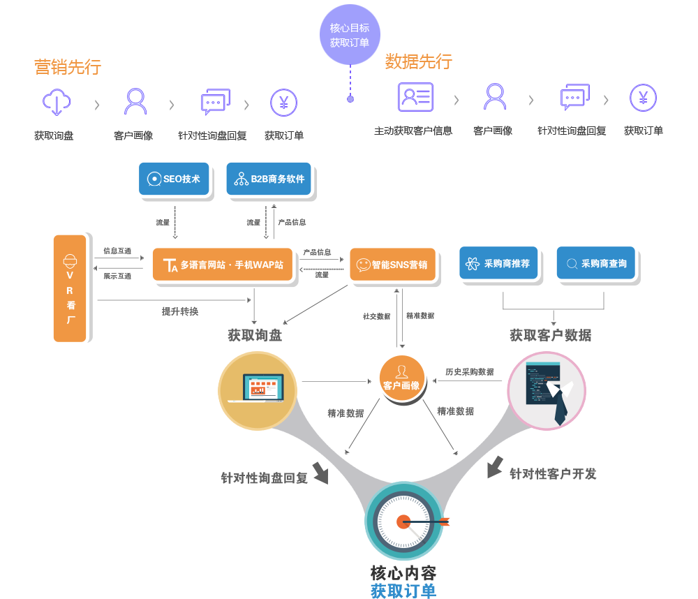 SEO技術通過搜索引擎為網(wǎng)站帶來流量,網(wǎng)站上展示VR全景看廠提升轉(zhuǎn)化率,產(chǎn)生更多詢盤。對詢盤進行曾經(jīng)采購行為分析,客戶畫像,進行深度SNS挖掘獲得客戶詳細情況,并有目的地精準聯(lián)系,獲得訂單。
