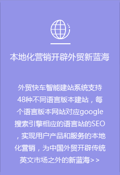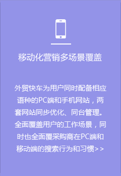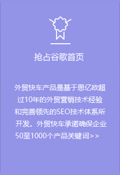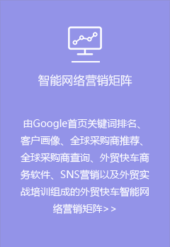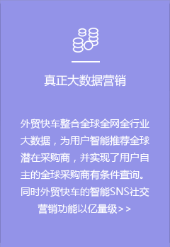 外貿(mào)快車是基于大數(shù)據(jù)和云計算的智能網(wǎng)絡營銷系統(tǒng)平臺。依托五大功能系統(tǒng),幫助外貿(mào)企業(yè)智能創(chuàng)建多語種營銷型網(wǎng)站和先進的VR展示網(wǎng)站,通過采購商數(shù)據(jù)挖掘,以及SEO、SNS等多渠道網(wǎng)絡營銷,實現(xiàn)全球推廣和新興市場開發(fā)。