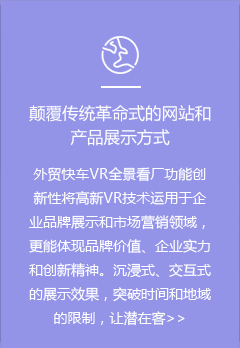 提升企業(yè)形象,VR看廠結合外貿(mào)快車網(wǎng)站產(chǎn)品展示,并可以在VR看廠點擊WEBSITE回到外貿(mào)快車網(wǎng)站里,提升轉(zhuǎn)換,獲取詢盤。