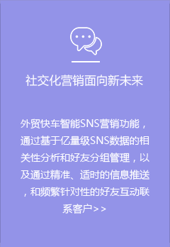 潛在采購商和詢盤客戶,都進行SNS深度挖掘了解企業(yè)情況。SNS可以讀取外貿(mào)快車網(wǎng)站上的產(chǎn)品進行發(fā)布,發(fā)布后留下該產(chǎn)品的網(wǎng)址讓有興趣的用戶再點擊進入外貿(mào)快車網(wǎng)站,為外貿(mào)快車網(wǎng)站帶去流量,再轉(zhuǎn)換成詢盤。同時,SNS營銷系統(tǒng)又可以進行商業(yè)公司挖掘,挖掘出的商業(yè)公司與潛在采購商進行數(shù)據(jù)對比融合,更進一步撐握企業(yè)情況,再進行精準聯(lián)系,獲得SNS詢盤。